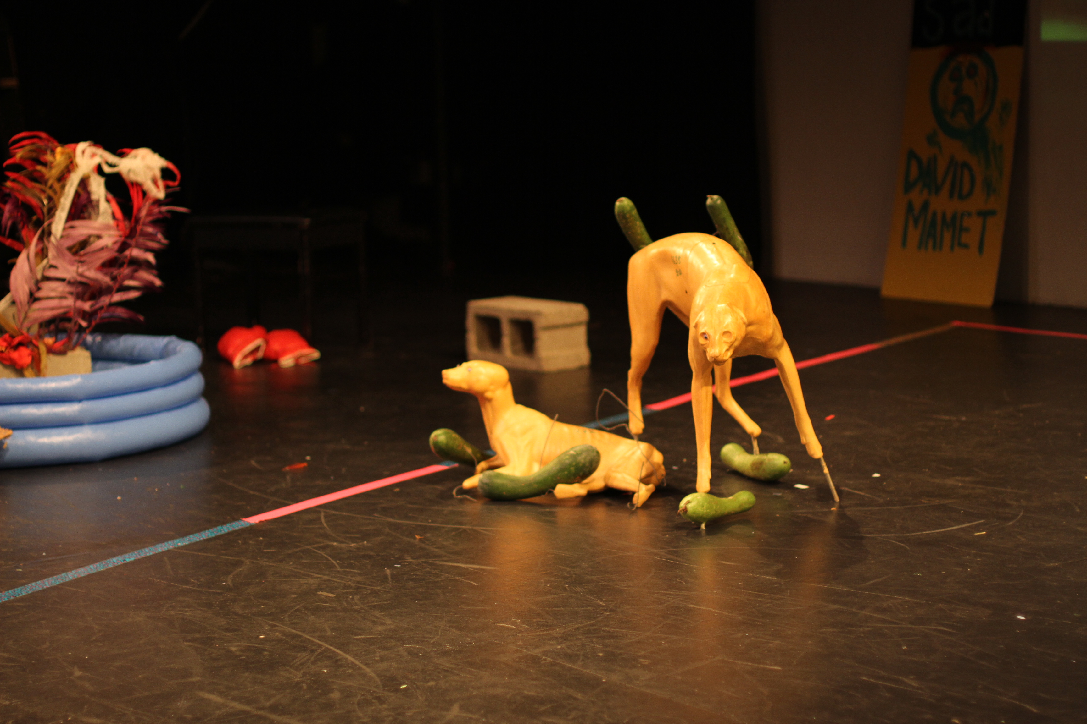 [Description: Two taxidermy models (aka THEATER DOGS) with fresh cucumbers as feet commune as a pack beside a periwinkle inflatable pool and a concrete block. A sign reading “Sad David Mamet” in the background]